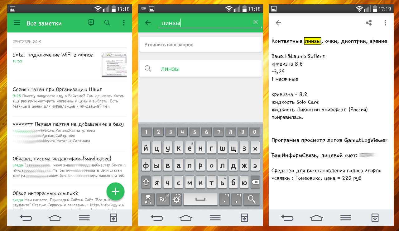 Например, захожу в Оптику — нужно подобрать линзы. Ввожу в поиске «линзы» и быстро нахожу нужный блокнот со всеми показателями: