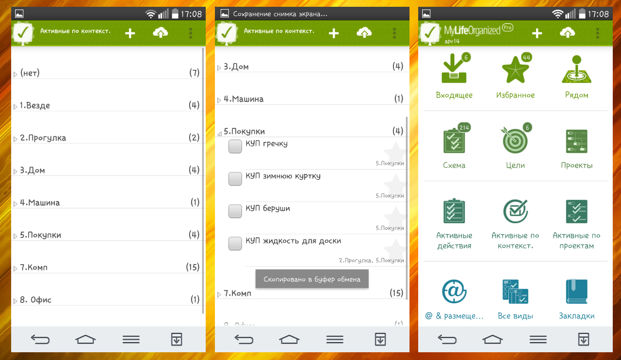 Про мою систему GTD я уже писал. Мобильная MLO нужна для отображения и выполнения задач на ходу. Например, зашли в магазин, включили это приложение, включили контекст «Покупки»: