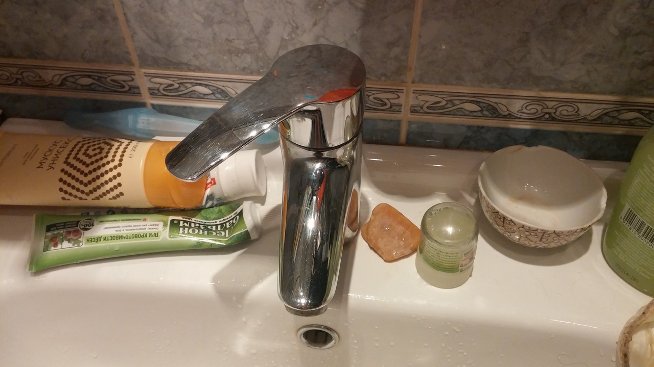 2 других смесителя давно пора выбрасывать. Местами ржавчина. Но главное — отвратительно работают. Настроить нужную температуру очень сложно.