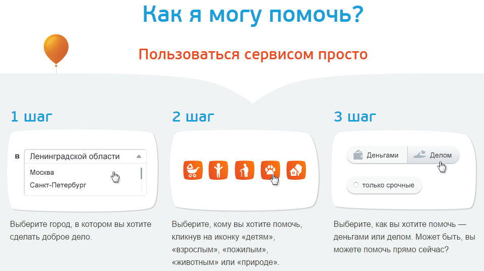 С необычной фишкой — вы можете помочь не только деньгами, но еще и делом: «отвезти кого-то в больницу, упаковать подарки, написать письмо. Иногда профессиональная: тут нужны ваши знания и опыт».