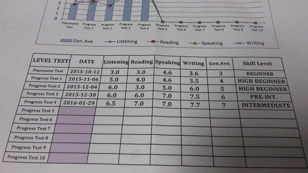 Итого за четыре месяца я выросла с beginner до intermediate. Первая строка – первый тест по определению уровня. Прогресс-тест проводится каждые четыре недели: