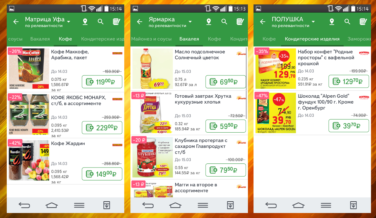 В радиусе километра вокруг моего дома десять сетевых супермаркетов. При желании можно постоянно питаться только продуктами по акции, но кто станет обходить все десять магазинов, чтобы взять брошюры. Мне хотелось систематизировать эти данные и принести их пользователю на ладони, — объясняет идею Шагарина. Источник
