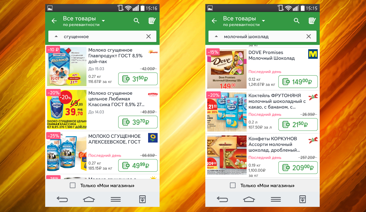- С функцией поиска, например, вот по запросу «молочный шоколад» или «сгущенное молоко»: