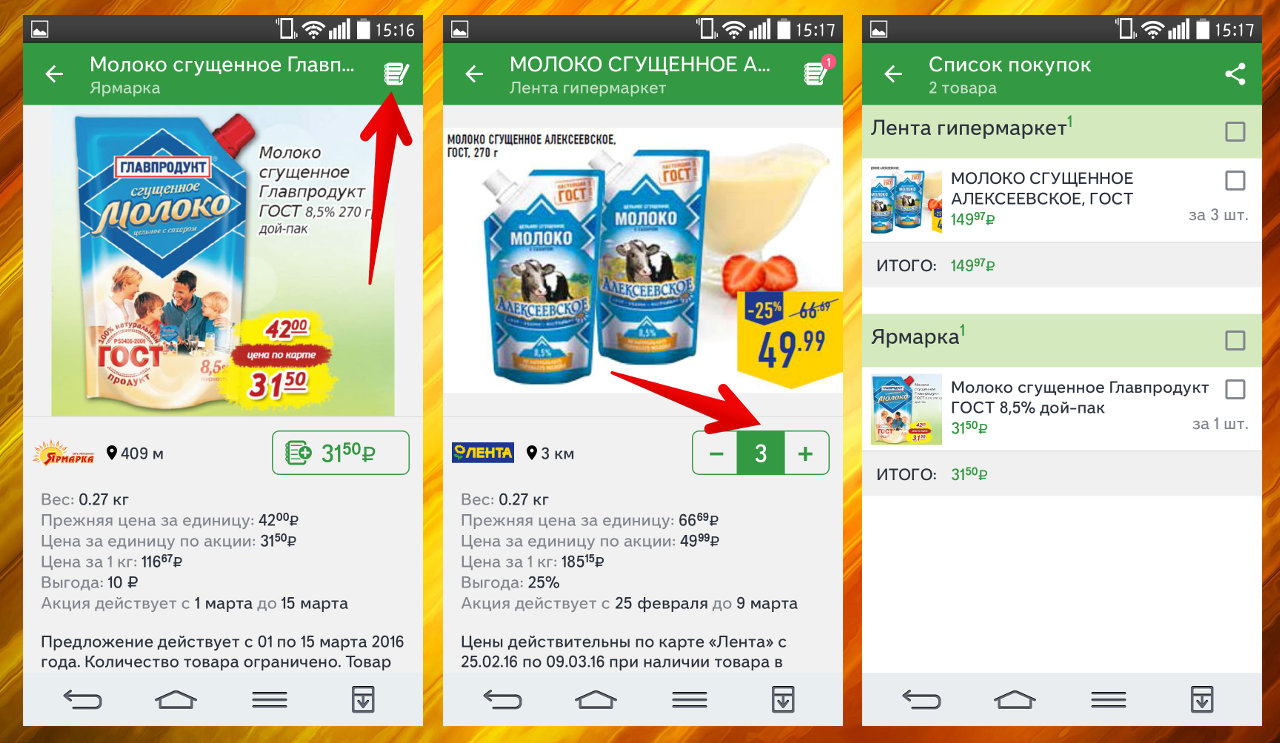 - А вот, что мне крайне понравилось — список покупок. Вы можете набирать туда продукты из разных магазинов: