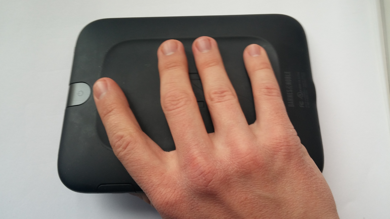 Nook мне нравится за свою эргономику. Его удобно держать в руке, он не соскальзывает благодаря прорезиненному покрытию и задней выемке: