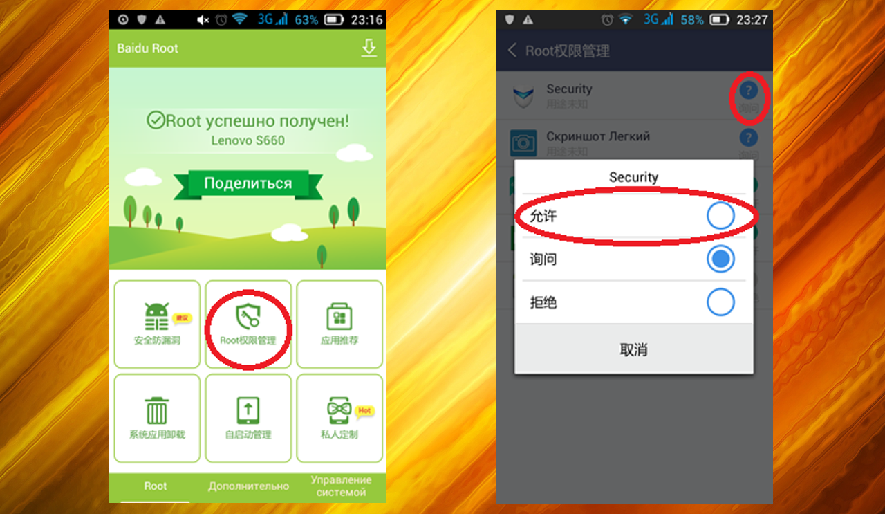 Если все прошло хорошо, приложение, которому требуется рут, будет спрашивать разрешение на него у Baidu, а Baidu спросит у вас. На китайском. Не переживайте, я провел два эксперимента и установил, что слева находится «Да»: