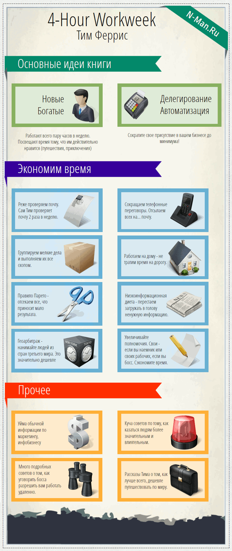 В этой статье вы прочтете небольшой обзор книги Тима Ферриса (Tim Ferris) «The 4-Hour Workweek» более известную в России, как «Как работать по 4 часа в неделю и при этом не торчать в офисе «от звонка до звонка», жить где угодно и богатеть».