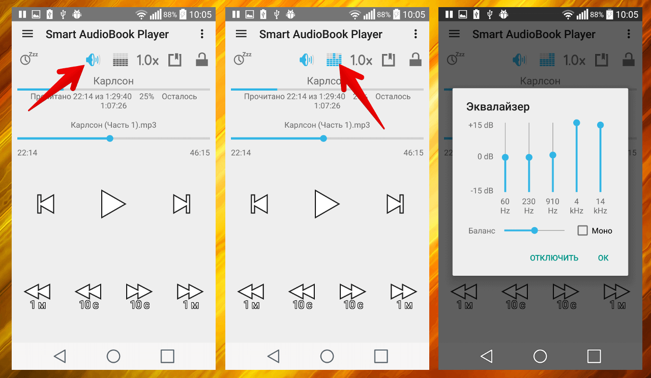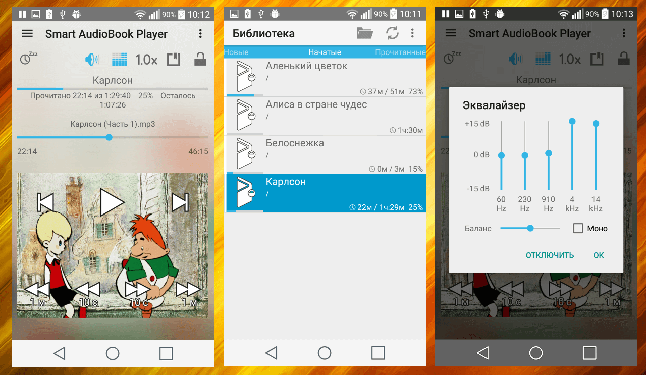 - Программа запоминает все настройки (позицию, громкость, скорость) для КАЖДОЙ книги. Удивительно удобно! Ведь все аудиозаписи разные по качеству — не нужно каждый раз менять настройки. Чтобы все работало идеально нужно выполнять простое правило «1 книга — 1 папка». Если свалить все в одну папку, то он перестанет запоминать позиции и настройки эквалайзера.