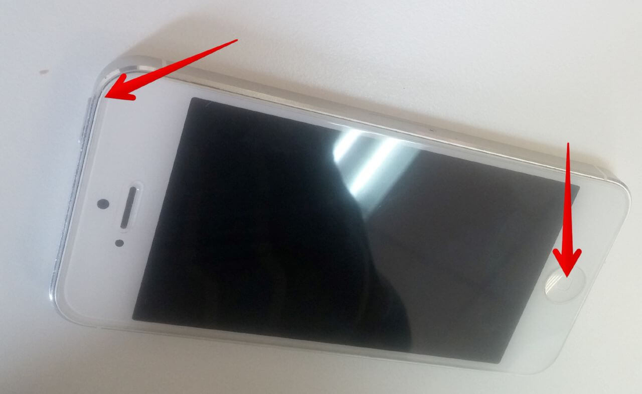 нужно зажать одновременно 2 кнопки: кнопку Home (круглая кнопка снизу) и кнопку блокировки (сверху).