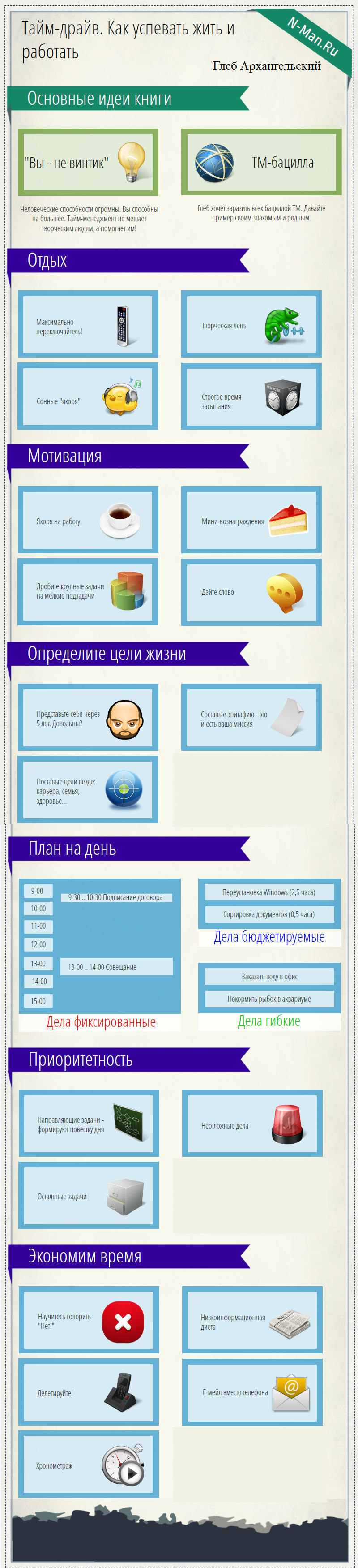 Книга «Тайм-драйв. Как успевать жить и работать» Глеба Архангельского представляет собой интересное исключение среди литературы по самосовершенствованию и бизнесу от русских авторов, не являясь простой копией зарубежных источников. Автор акцентирует внимание на важности качества труда, подчеркивая, что отдых и перерывы играют ключевую роль в повышении продуктивности. Благодаря структурированным рекомендациям и советам по планированию отдыха книга становится ценным путеводителем для тех, кто стремится к эффективному использованию времени и ресурсов.
